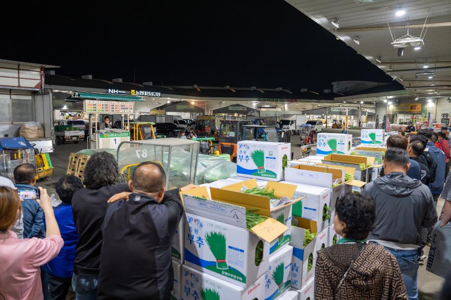 중부권 최고의 품질을 자랑하는 증평‘장뜰부추’가 4월 첫 수확을 시작해 연일 출하에 박차를 가하는 가운데, 이재영 증평군수가 지난 24일 대전 농산물 도매시장 경매 현장을 직접 찾았다.