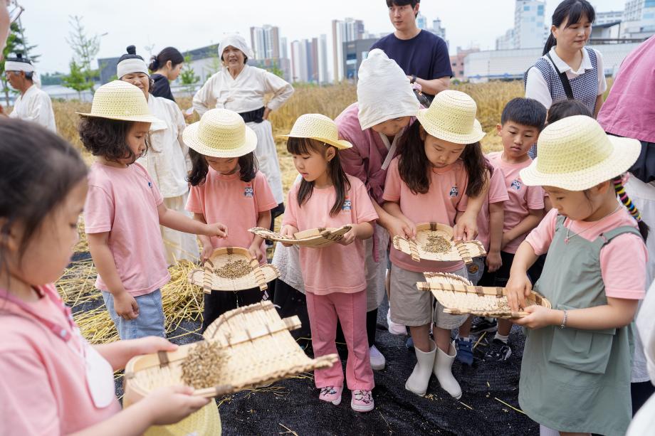 충북 증평군은 17일 증평읍 송산리 764번지(송산초등학교용 부지) 일원에서 지역 내 어린이와 마을주민 등 100여 명이 참여한 가운데 보리타작 체험행사를 진행했다.