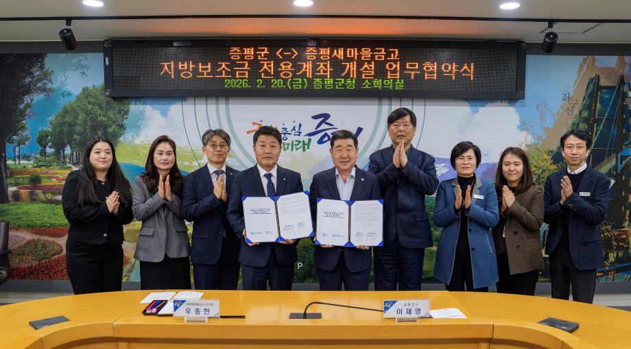 충북 증평군은 20일 군청 소회의실에서 증평새마을금고와 업무협약을 체결하고, 지방보조금 전용계좌 개설 금융기관을 기존 군 금고에서 금고 외 금융기관까지 확대했다고 밝혔다.