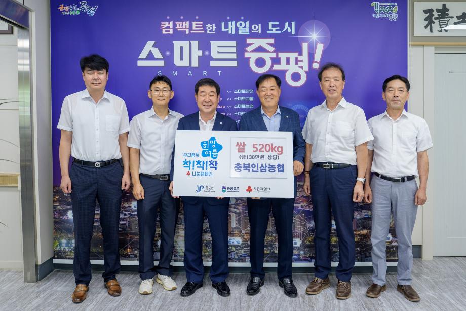 충북 증평군은 충북인삼농협(조합장 소진호)이 8일 군청에 방문해 쌀 520kg(130만원 상당)를 기탁했다고 밝혔다.