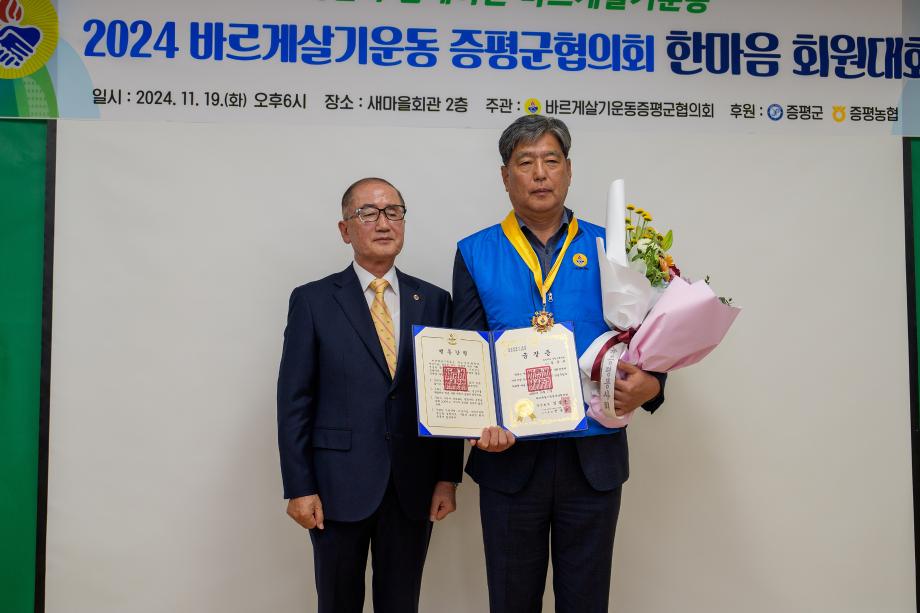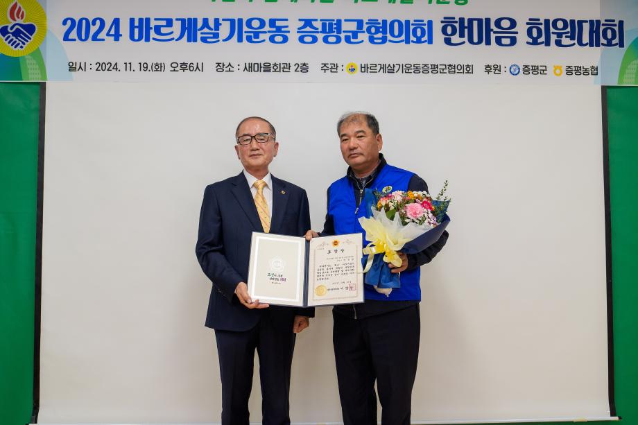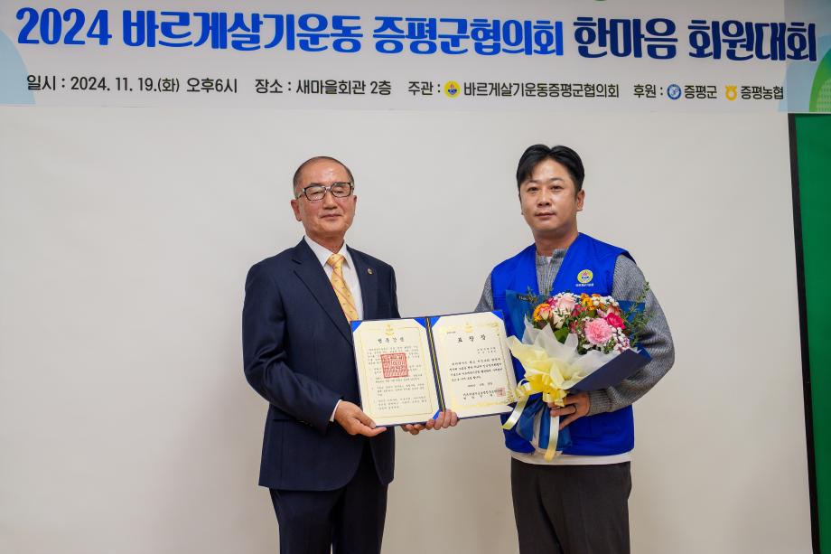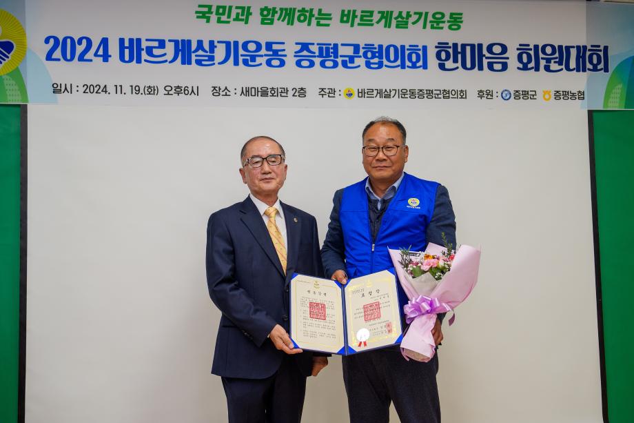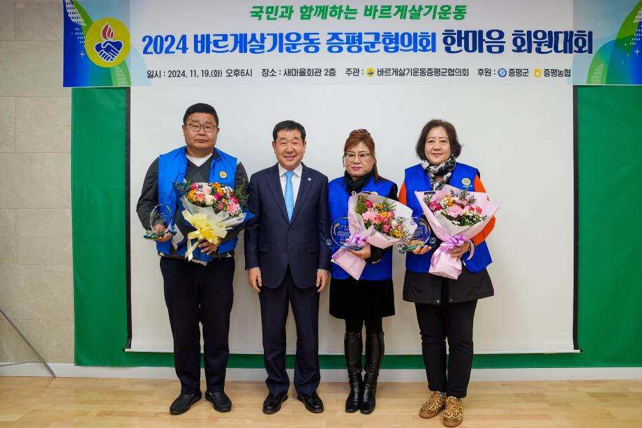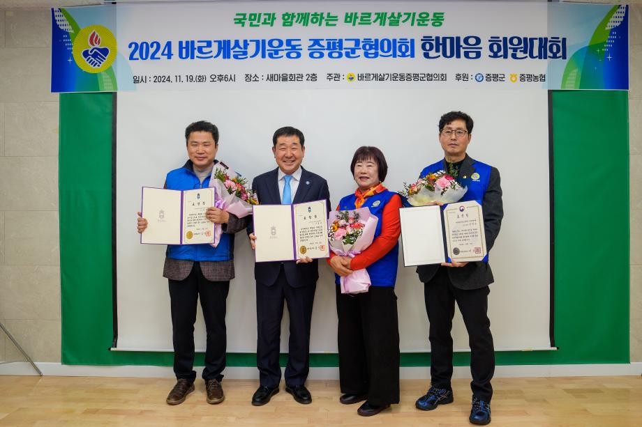 바르게살기운동증평군협의회(회장 연병석)는 19일 오후 6시 새마을회관 2층 회의실에서‘2024 바르게살기운동 증평군 한마음 회원대회’를 개최했다.