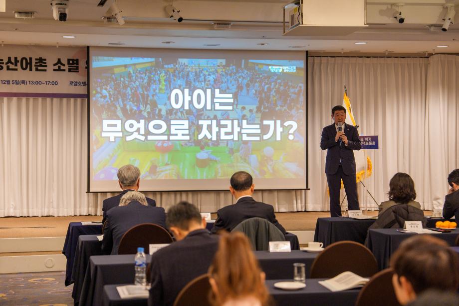 이재영 증평군수가 5일 로얄호텔서울(서울 중구)에서 열린 농산어촌 소멸 위기 극복 정책토론회에서 ‘돌봄 위의 도시 증평’을 주제로 증평군의 지역소멸 및 저출산 극복 사례를 발표했다.